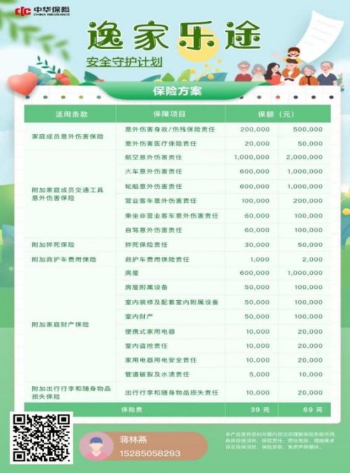 先看 “逸家乐途安全守护计划”——39 元能换啥?不是一杯奶茶,是全家的 “双重防护网”:人身端,意外身故 / 伤残最高 50 万、医疗 5 万,连航空(200 万)、火车轮船(各 100 万)的交通风险都拉满,猝死、救护车费用也能保;家庭财产端更 “狠”,房子(100 万)、装修、家电、室内财产甚至被盗抢都能赔!69 元版保障直接翻倍,这 “花小钱兜全险” 的操作,把 “实用” 焊死在保障里。