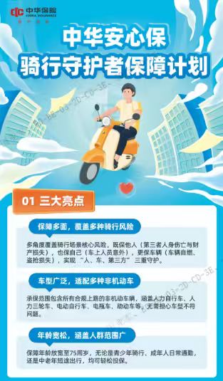 而日常靠两轮出行的通勤党、接送娃家长,“中华安心保・骑行守护者” 就是专属 “安全盾”:不管是电动自行车、人力车还是平衡车,既能保驾驶人自身意外,又能赔第三者的伤亡 / 财产损失,连车辆损毁都管;承保年龄从 3 岁到 75 岁,不管是学生党骑车上学,还是老人代步出行,都能把骑行风险稳稳接住。