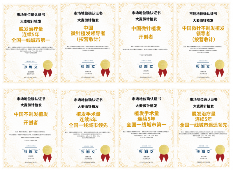 凭借着卓越的技术优势,大麦微针植发在市场口碑方面也取得了优异成绩,获得全球增长咨询公司弗若斯特沙利文颁发的 8 项市场地位认证。